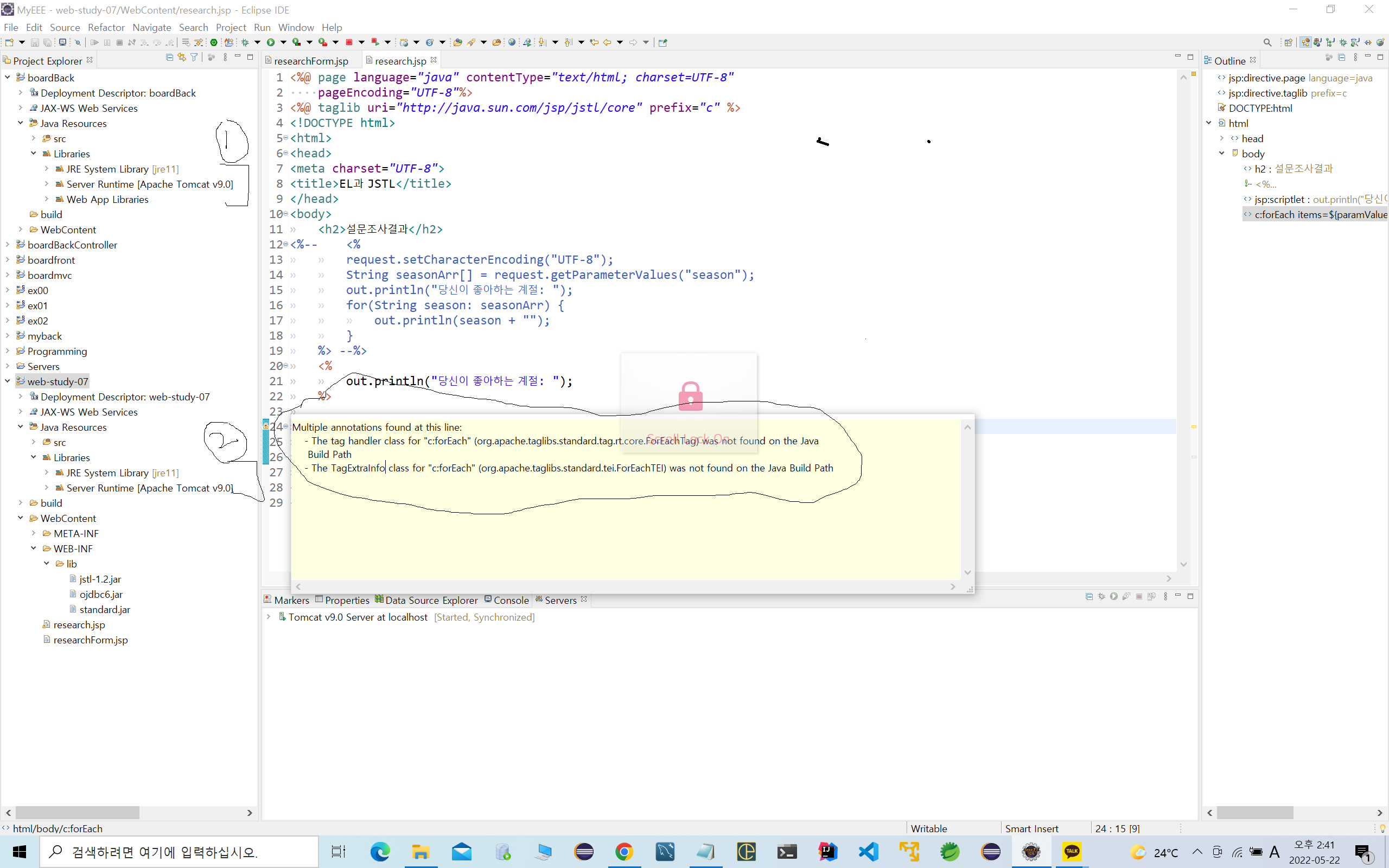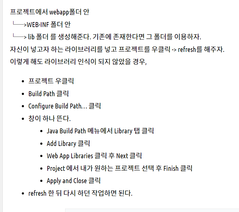 1번 프로젝트에는 Libraries > Web App Libraries폴더가 있고 폴더안에 라이브러리가 존재하지만, 2번프로젝트에는 Web App Libraries폴더가 존재하지 않는다. 이로인해 ' ~~~ was not found on the java build path' 오류 발생